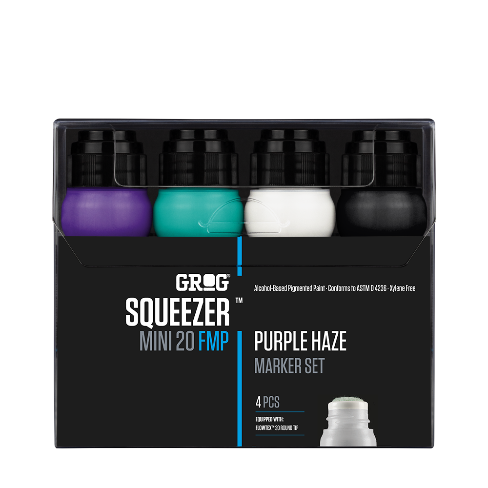Made of a strong plastic clearbox, SQUEEZER MINI 20 FMP PURPLE HAZE MARKER SET is composed of the most psychedelic colors from the Full Metal Paint range.